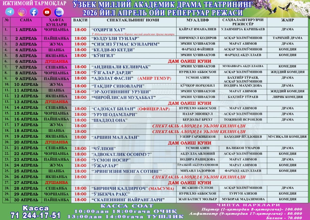 Боғланиш: (+99871) 244-32-93milliy.teatr@mail.ru